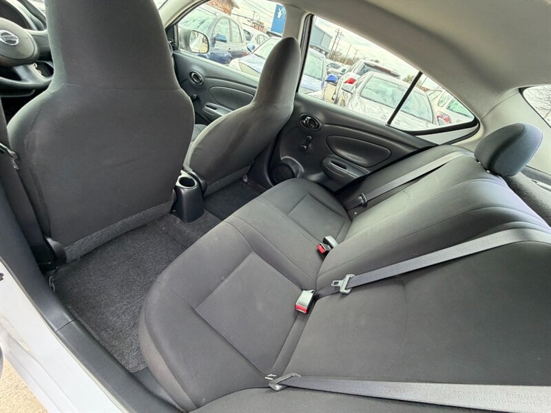 2013 Nissan Versa 1.6 S — White exterior, Black interior. Powered by a 1.6L I4 with 109 hp and 107 ft·lb of torque, this vehicle gets about 26 MPG city and 35 MPG highway and has under 57,000 miles (averaging less than 5,000 miles/year). Factory-standard equipment includes air conditioning, cloth seating, split-folding rear seat, AM/FM/CD/MP3 audio with auxiliary input, power steering, power locks and windows, remote keyless entry, tilt steering, steel wheels with covers, and standard safety features such as front and side airbags, ABS and tire pressure monitoring. Clean CARFAX, one owner, excellent overall condition.
