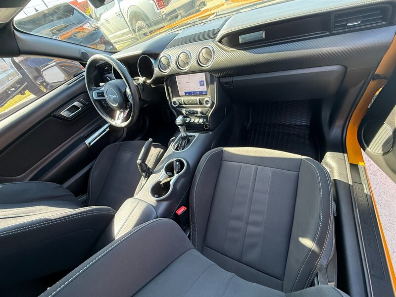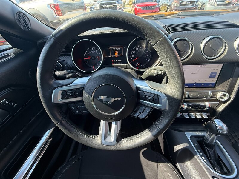 Inside, you'll find a well-appointed cabin featuring high-quality materials and modern technology. Standard features include Ford's SYNC® 3 infotainment system with a user-friendly touchscreen interface, Apple CarPlay and Android Auto compatibility for seamless smartphone integration, and a six-speaker audio system that delivers crisp sound. The Mustang also comes equipped with dual-zone climate control, power-adjustable front seats, and ambient interior lighting to enhance your driving experience.